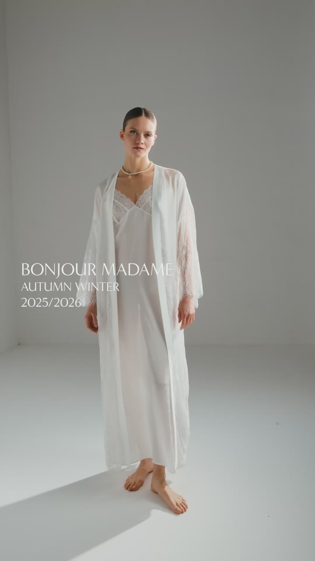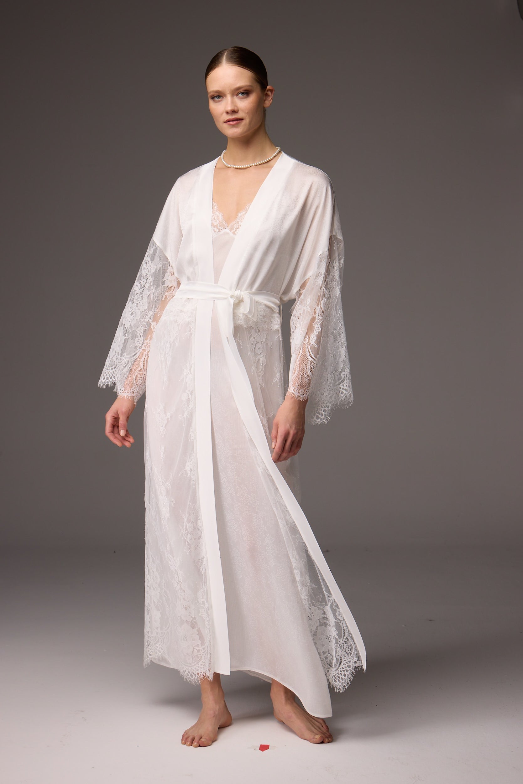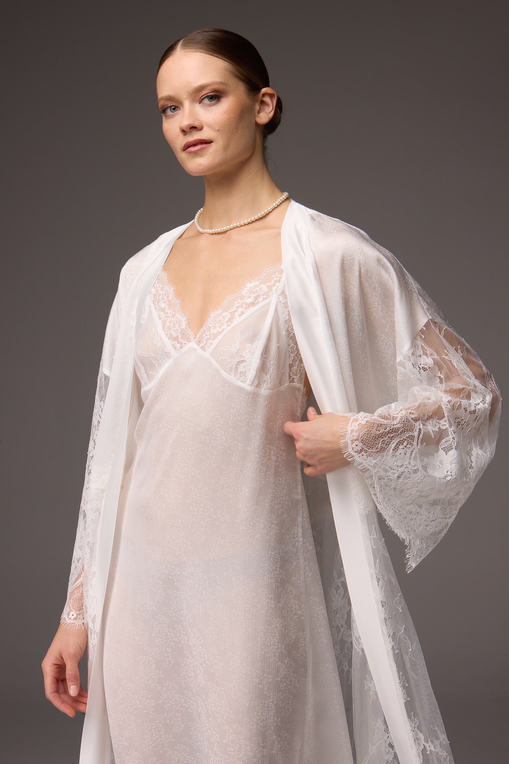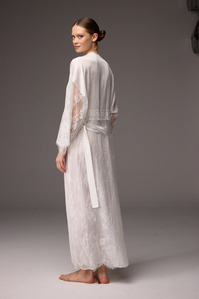 Sabahlık:  Kolları  dantel detaylı, kendinden nakışlı çiçek desenli, uzun sabahlık