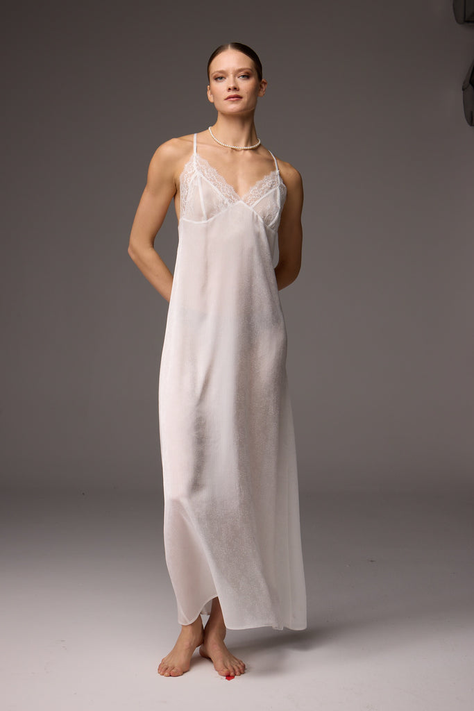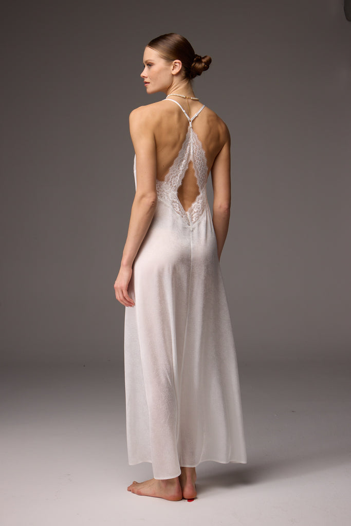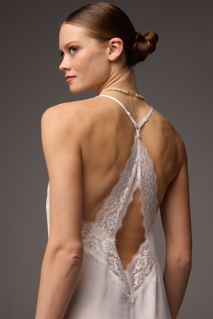 Gecelik: Ayarlanabilir askılı, göğsü ve sırtı dantel, uzun saten gecelik