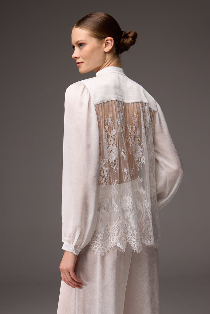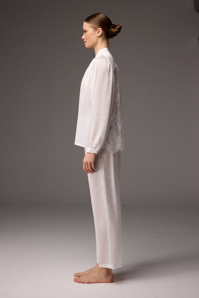 Üst: Gömlek yaka, önden düğmeli, sırt dantel  detaylı desenli, uzun kollu pijama üstü