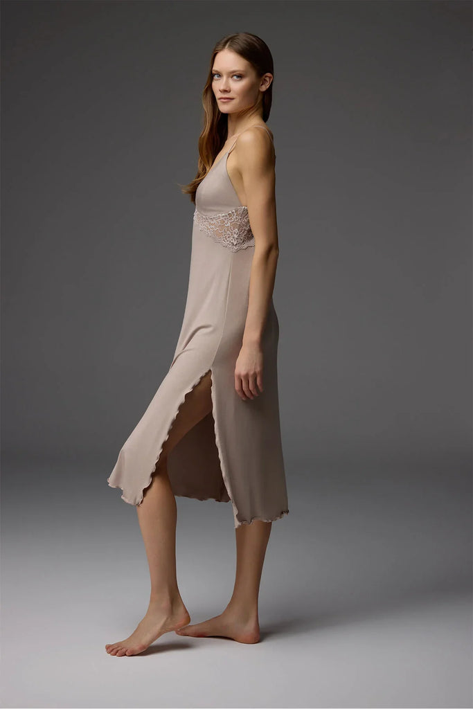 V yaka dantel detaylı ayarlanabilir askılı yırtmaçlı uzun gecelik