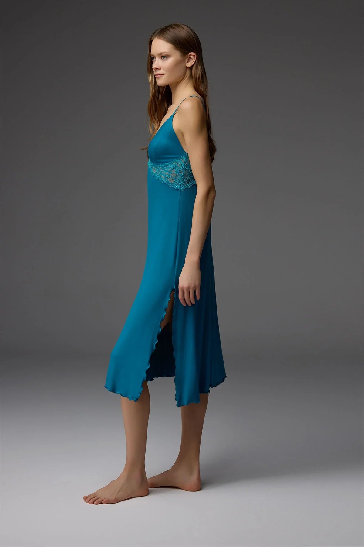 V yaka dantel detaylı ayarlanabilir askılı yırtmaçlı uzun gecelik