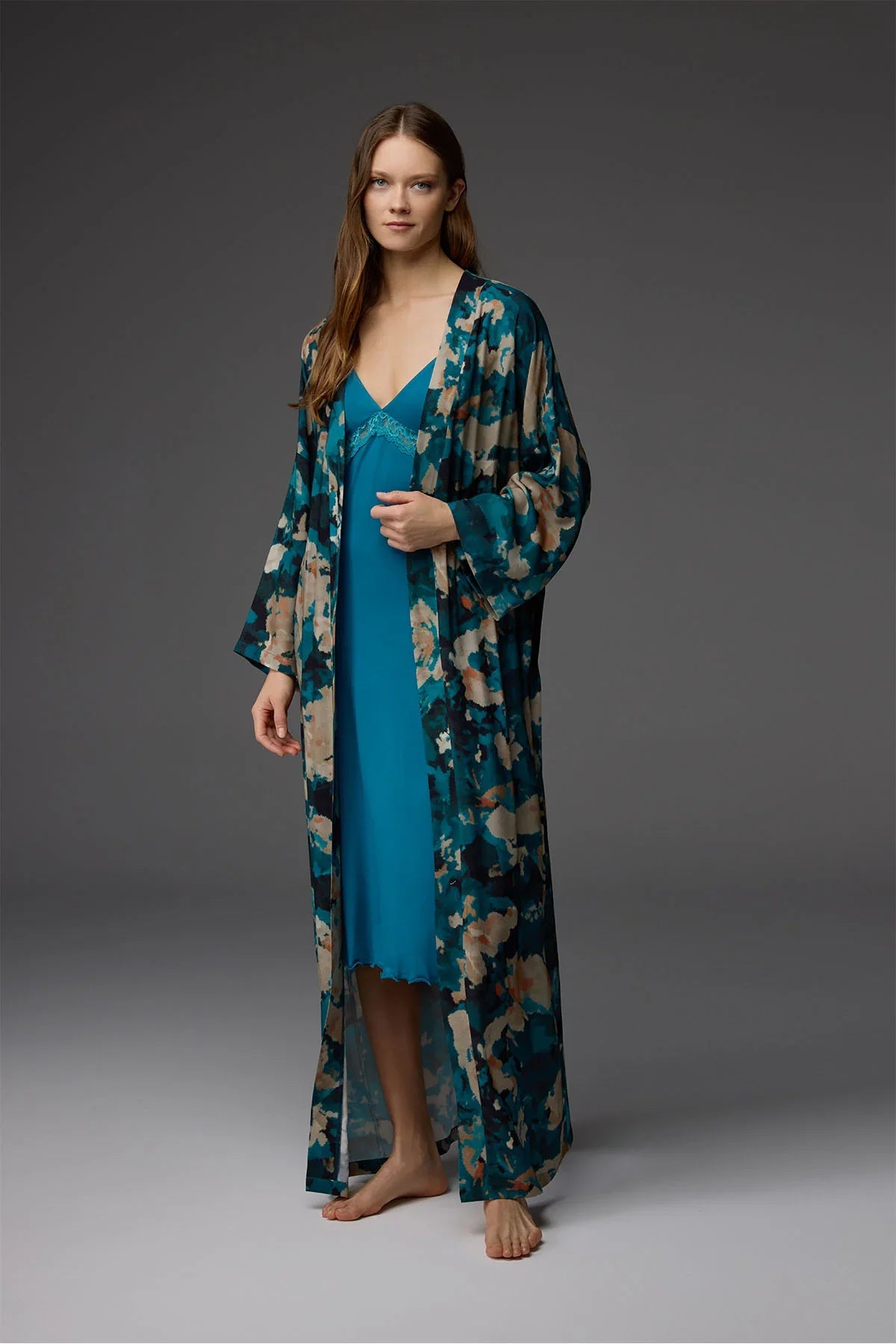 Desenli kemer detaylı uzun sabahlık