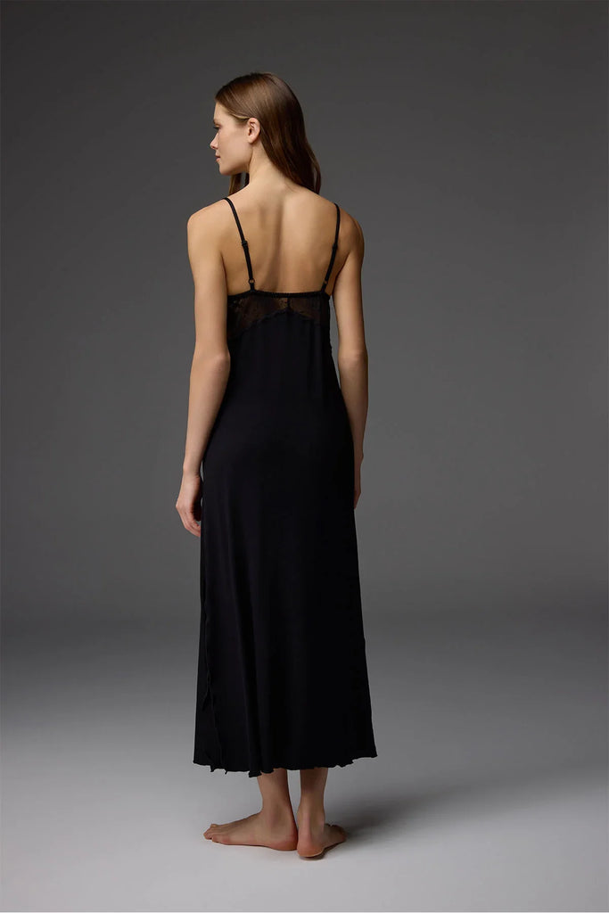 V yaka dantelli ayarlanabilir askılı uzun gecelik