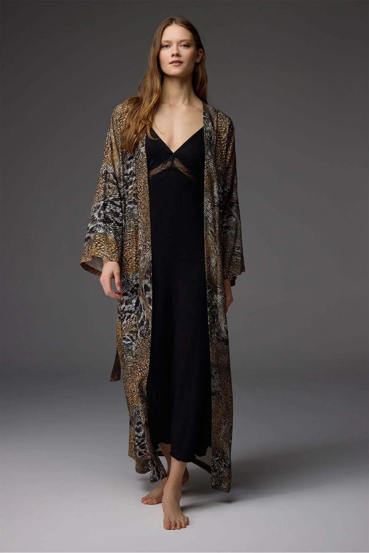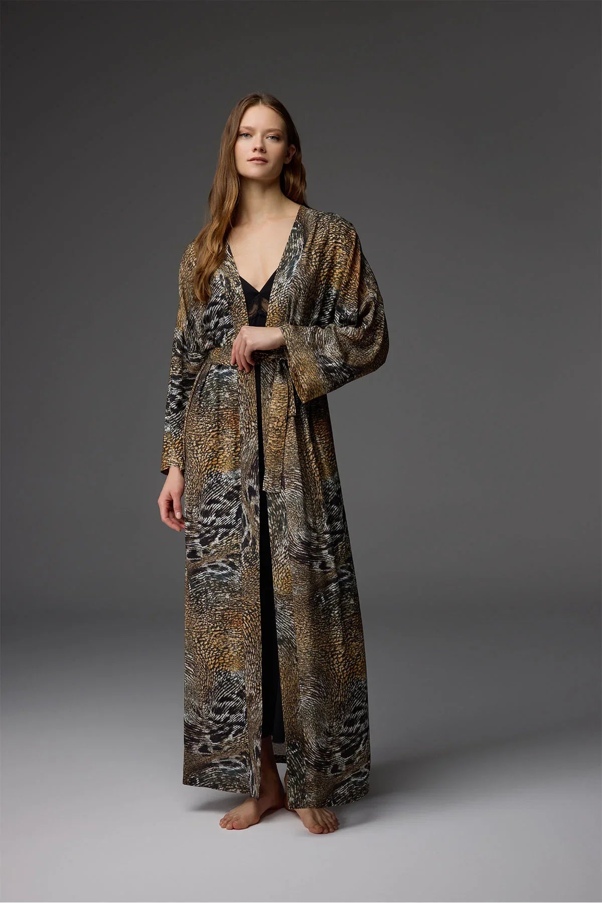 Desenli kemer detaylı uzun sabahlık