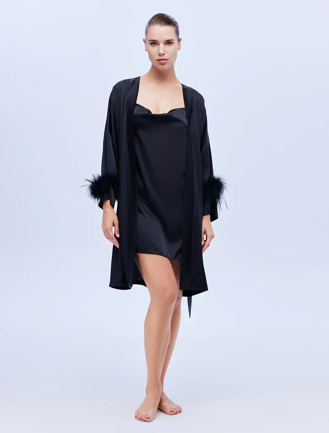 Saten Degaje Yaka Gecelik Tüy Detaylı Sabahlık Takım BM-1633